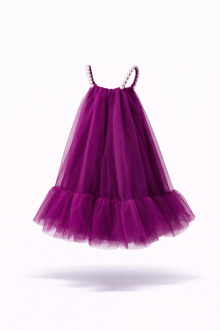 Φορεματάκι με σατέν φόδρα και μεταξωτό τούλι με φραμπαλά τελείωμα και πούπουλα στους ώμους